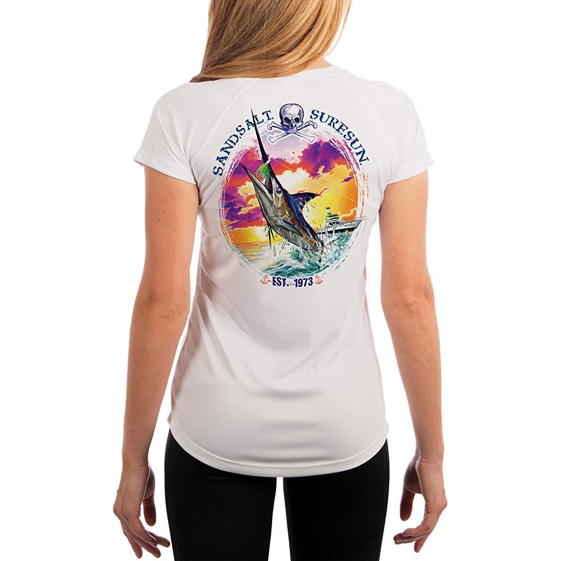 SAND.SALT.SURF.SUN. Blue Marlin Sunset Women's UPF 50+ UV Sun Protection Performance Short Sleeve T-Shirt