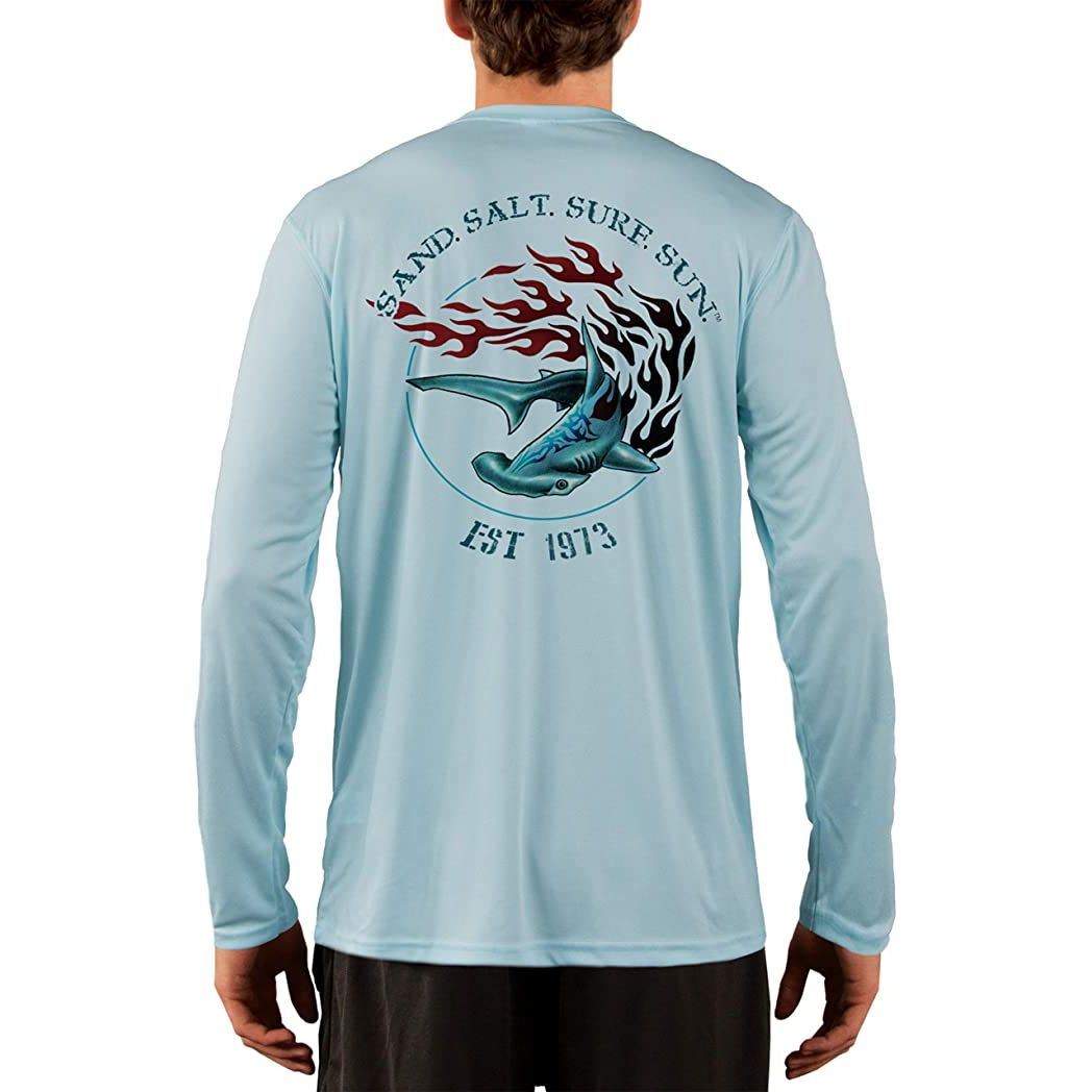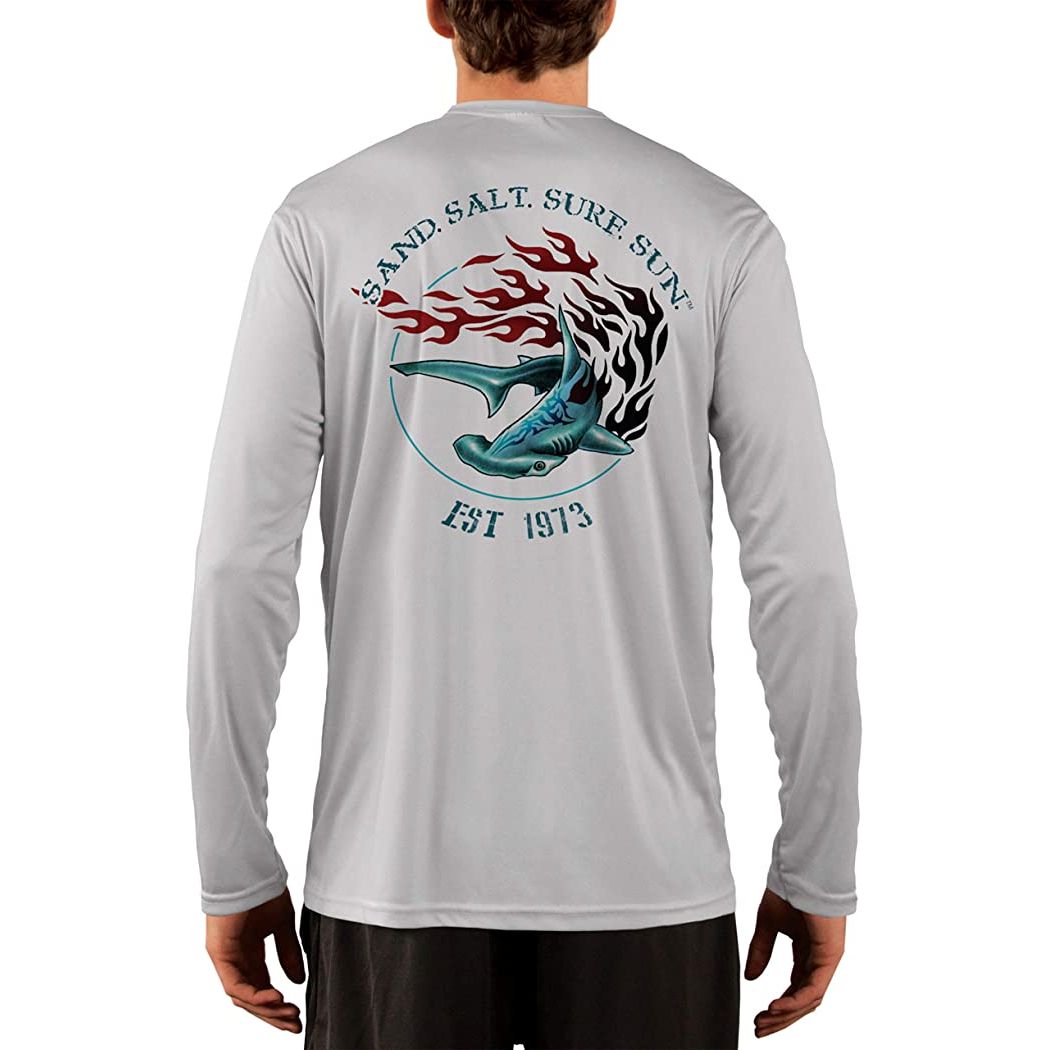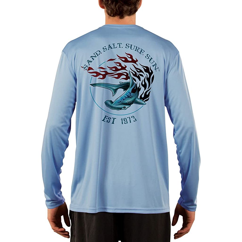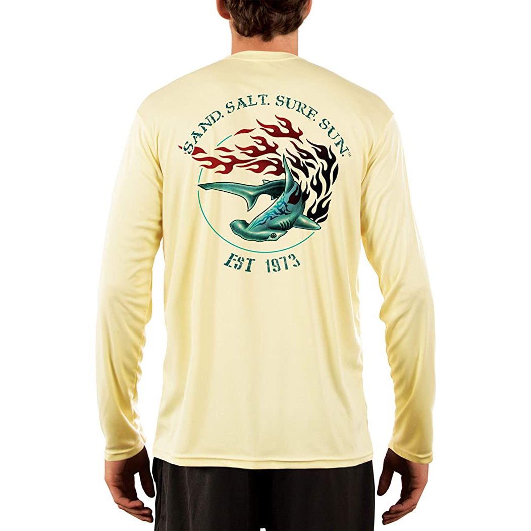 SAND.SALT.SURF.SUN. Flaming Shark Men's UPF 50+ UV Sun Protection Performance Long Sleeve T-Shirt